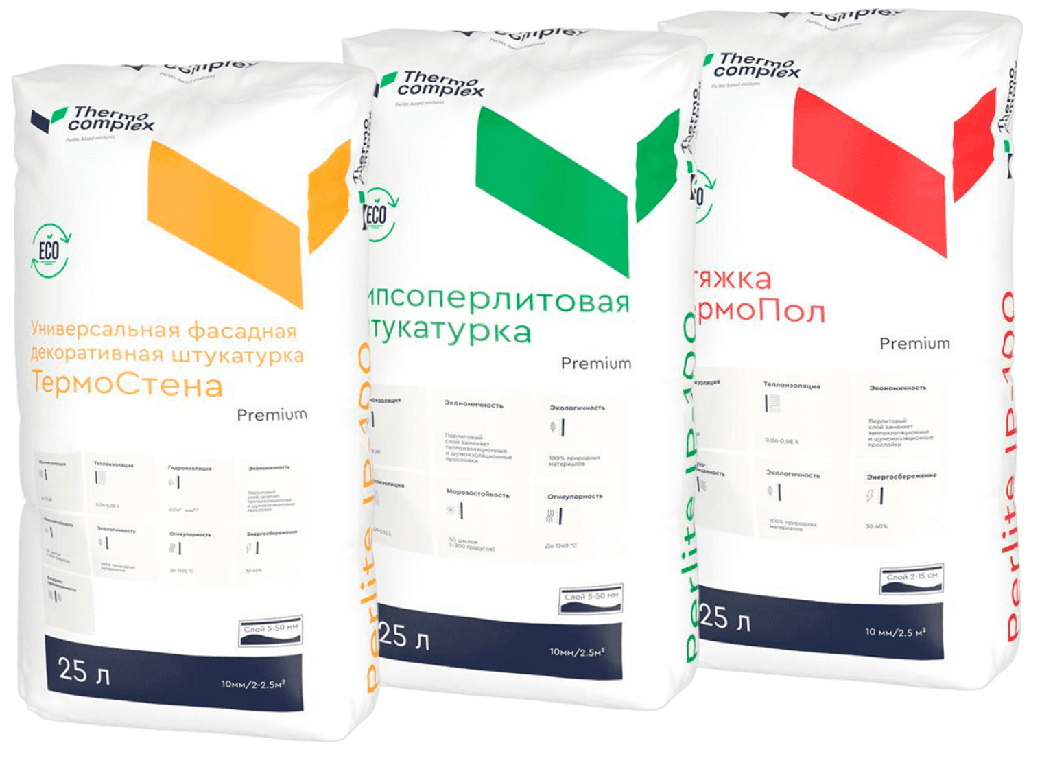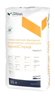 Перлитовая штукатурка «Термокомплекс. Универсальная смесь» (жёлтая упаковка) для наружных работ (фасадов), нанесённая слоем 2 см, по своим характеристикам соответствует утеплителю толщиной 10 см. При этом характеристики всей конструкции повышаются благодаря уникальным природным свойствам перлита.
